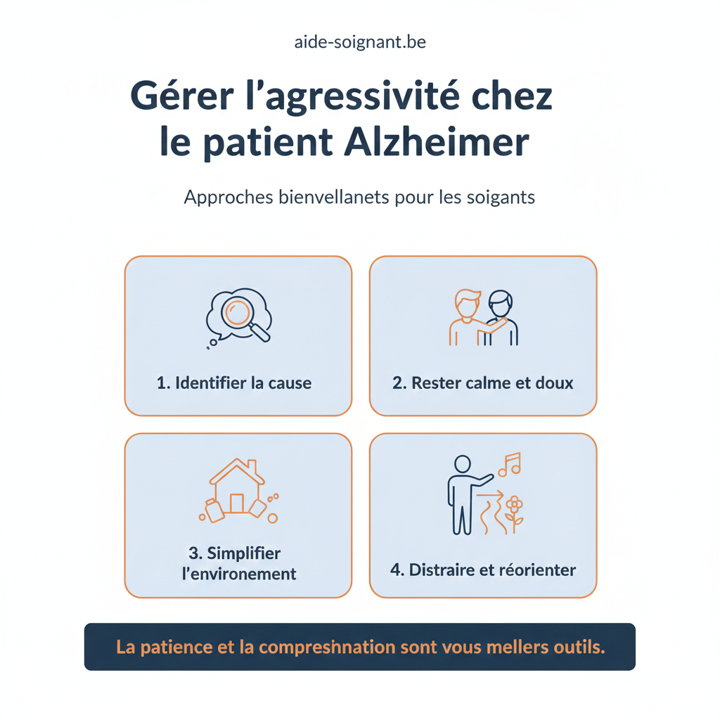 - Ne pas insister : Si le soin (toilette, change) provoque trop d’agitation, retirez-vous (si la sécurité le permet) et revenez 15 minutes plus tard. Le patient aura souvent oublié le conflit, mais l’émotion négative se sera apaisée.