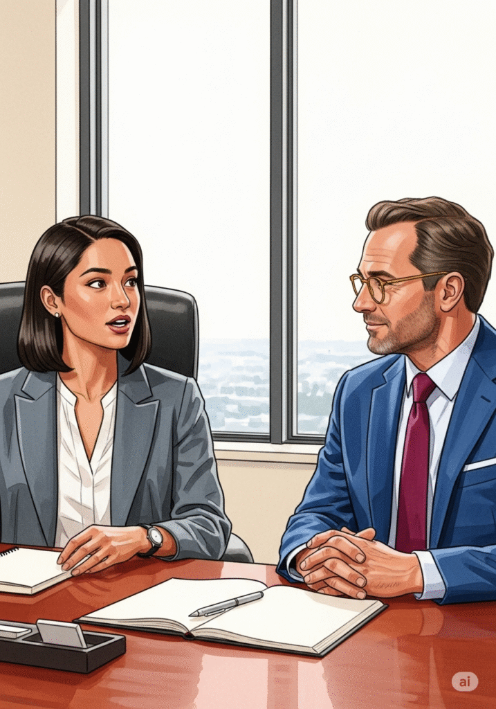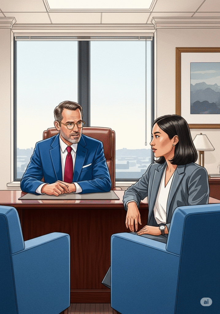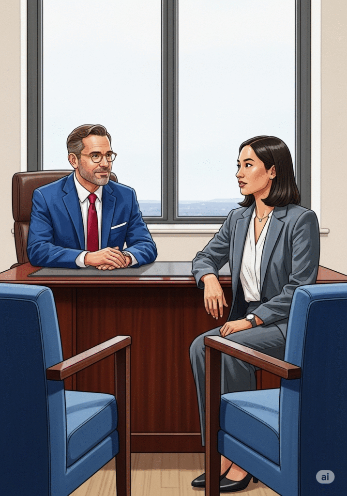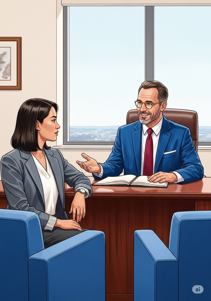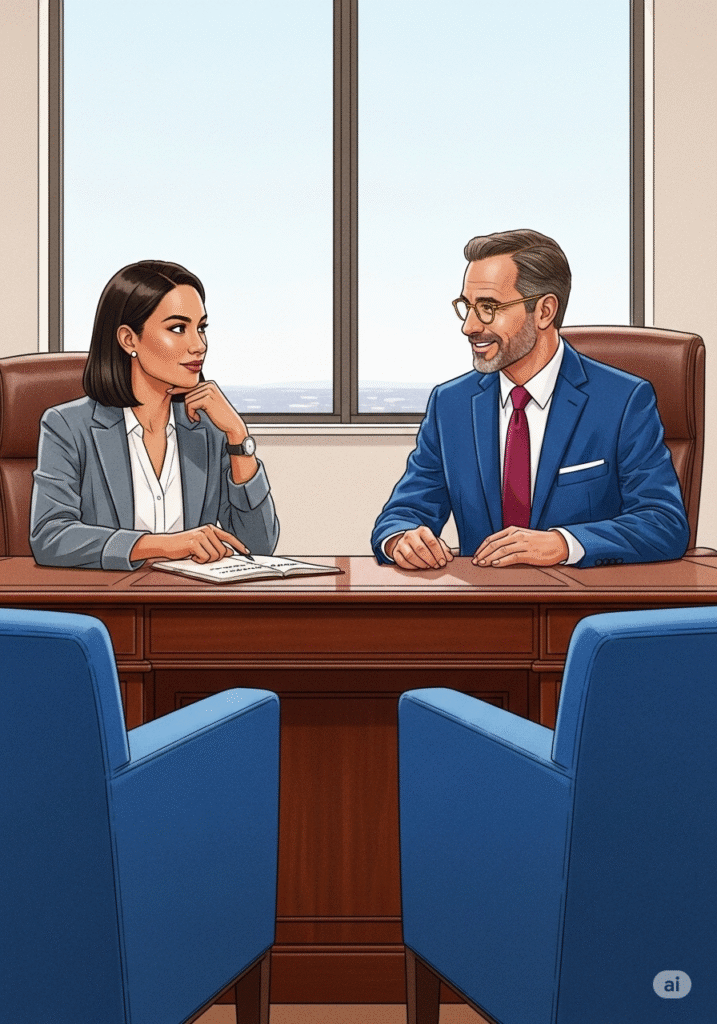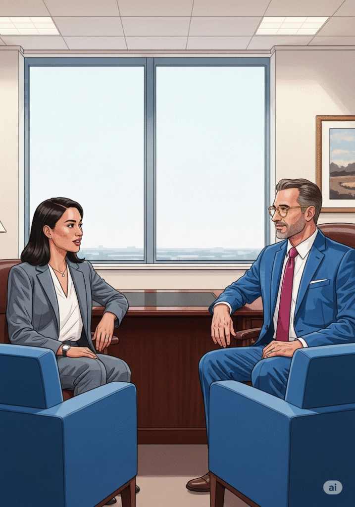 Valère l’accueille dans un bureau lumineux, offrant un café et un sourire encourageant. « Bonjour Clara, merci d’être venue. Installez-vous. Parlez-moi un peu de ce qui vous a amenée à postuler ici, spécifiquement à L’Élan. » Valère pose un stylo. Le ton est chaleureux mais professionnel. Clara sourit, immédiatement à l’aise. « Bonjour Monsieur Valère. Ce qui m’attire chez L’Élan, c’est votre réputation d’offrir une approche de soins holistique. Je cherche un environnement où la dignité et l’humain passent avant tout, et où la formation continue est valorisée. »