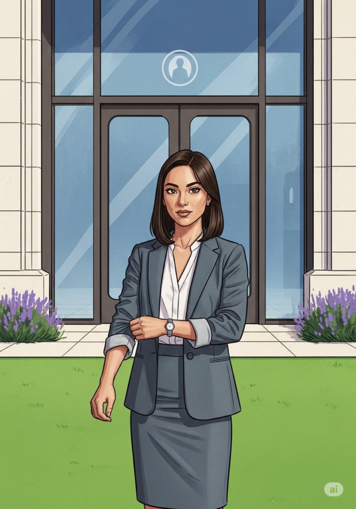 Clara arrive devant les portes élégantes du Centre Gériatrique « L’Élan ». Elle respire profondément l’air frais du matin. Elle est vêtue d’une tenue professionnelle simple et élégante, mais ce qui compte le plus, c’est la détermination dans ses yeux. Clara sait que ce n’est pas seulement un entretien, c’est l’opportunité de prouver que sa passion pour l’accompagnement et le soin est son plus grand moteur. Elle monte au bureau de Valère, le Responsable des Ressources Humaines.